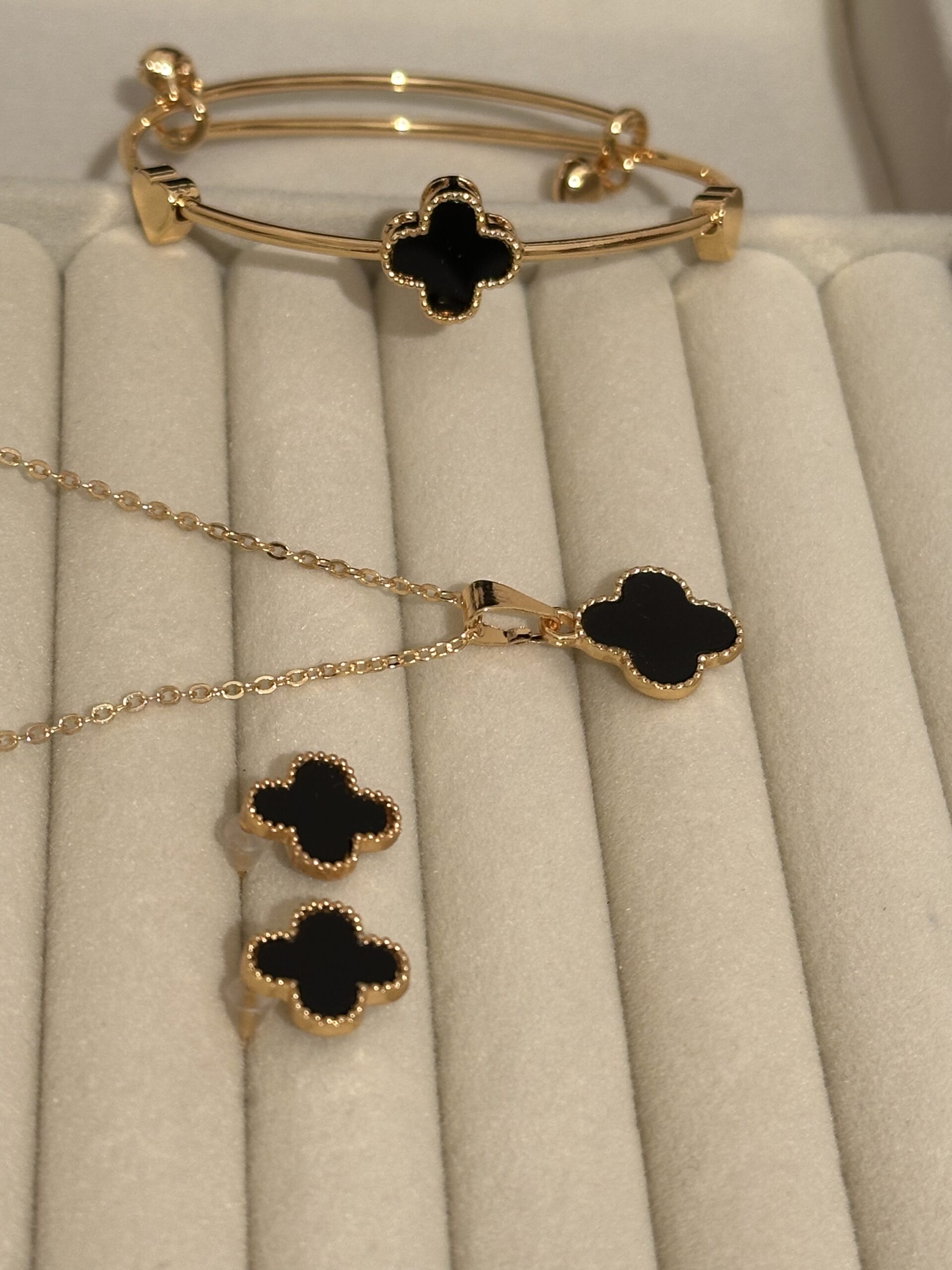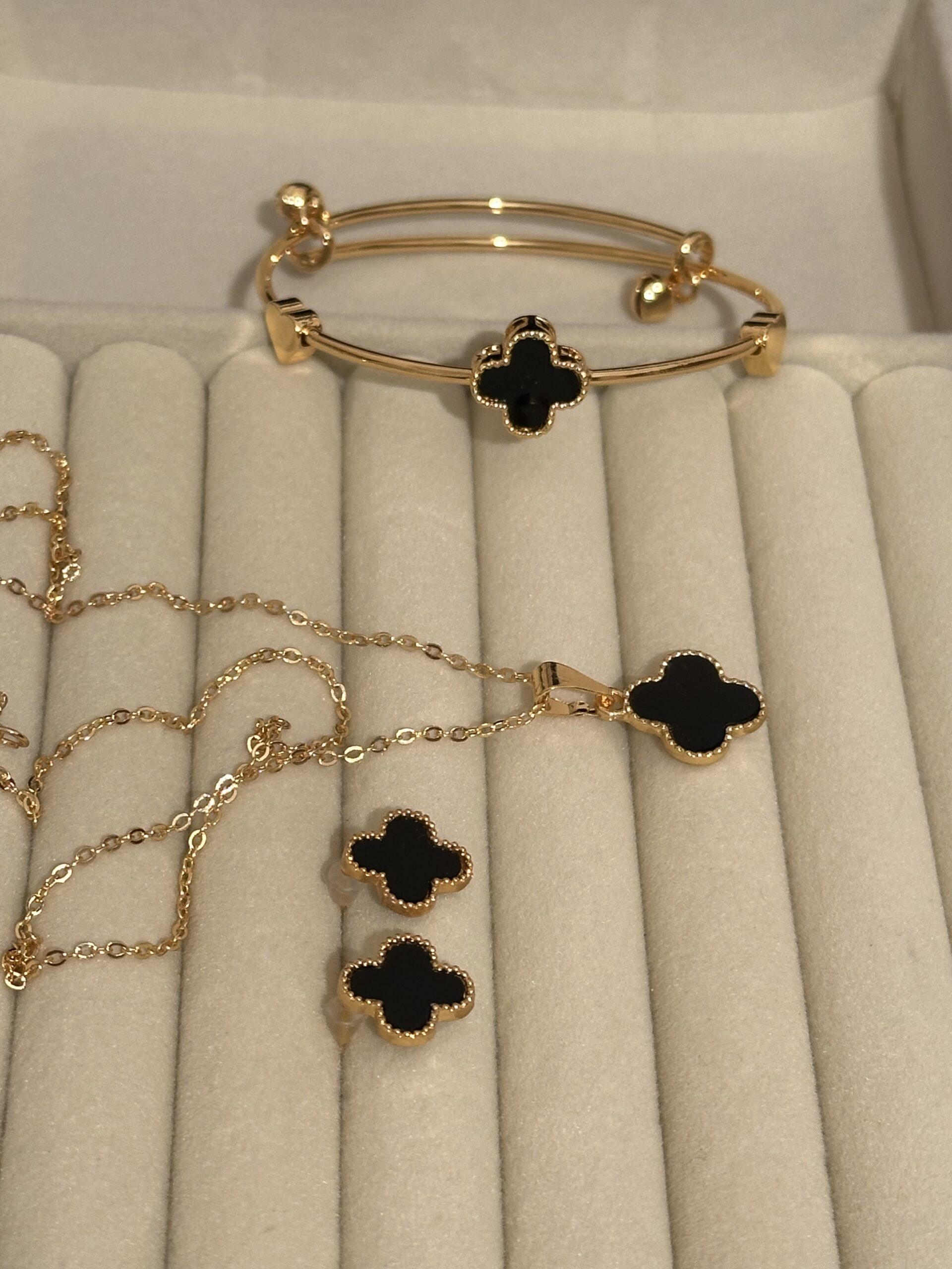 4-leaf design jewellery set including necklace, bracelet & earrings in golden and silver tones.